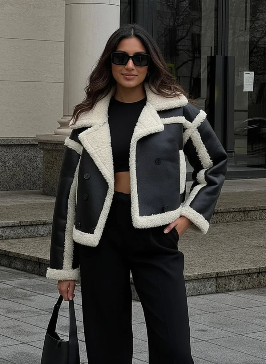 Stay warm in style with this women’s oversized shearling winter jacket, designed with a relaxed short cut and bold contrast trim. Crafted for both comfort and fashion, this cozy winter coat features a plush lining, wide collar, and roomy fit — making it the perfect layering piece for cold-weather outfits. Ideal for pairing with jeans, boots, or casual streetwear, this jacket brings modern flair to your winter wardrobe.